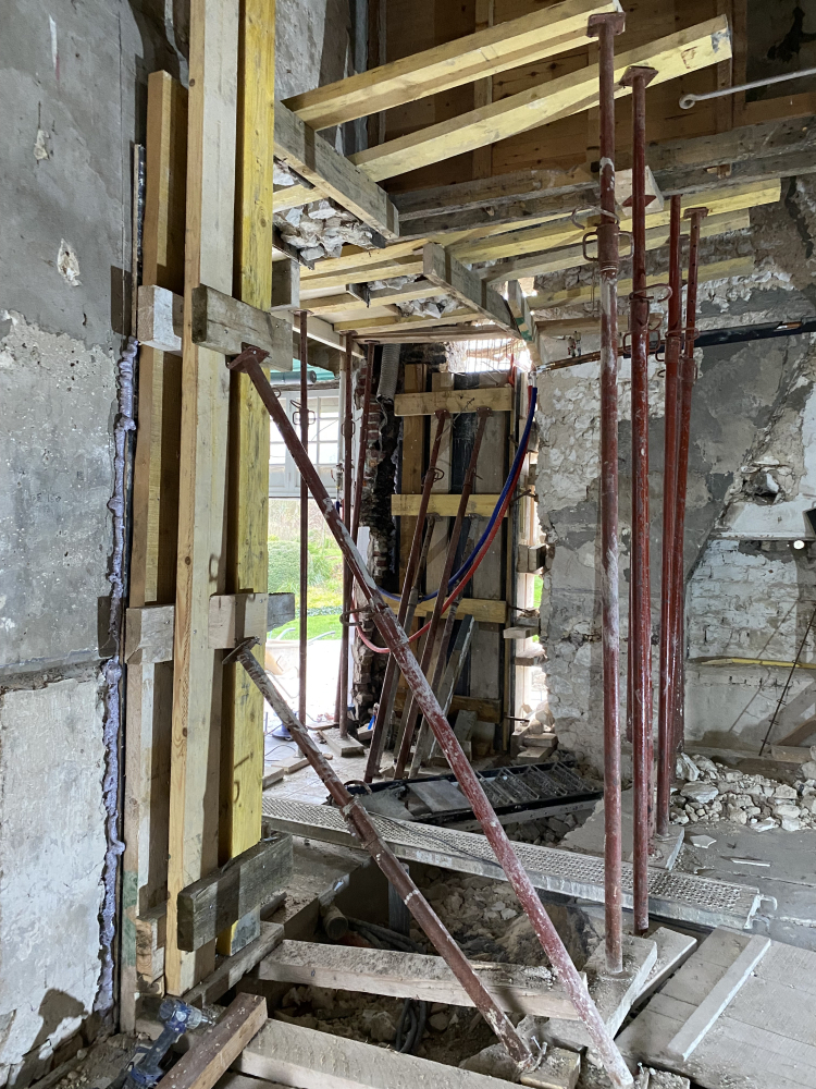 Nous avons étayé ce mur en pierre, cassé et réalisé poteaux/poutre à l'aide de plans de notre bureau d'études.